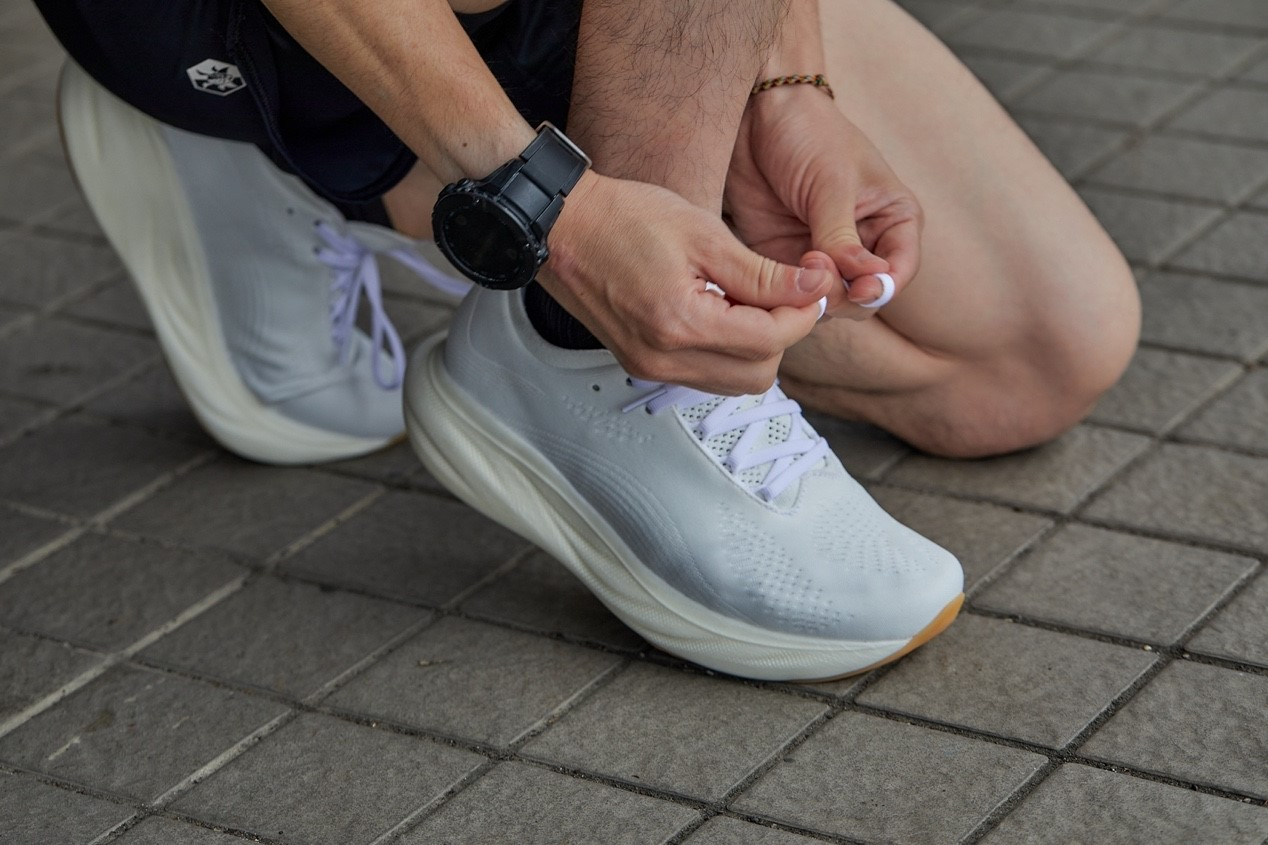 提起鞋,鬆開鞋帶,將雙足套入,沒錯!我實在不想講「人鞋合一」這種舊梗,但真的就是這樣啊!在足部沿著鞋領套入,沒有那種掐緊的感覺,取而代之的是種柔軟包覆的舒適感;拉緊鞋舌、束緊鞋帶,微微的風揚起,是跑鞋透氣度的展現,也像是啟航的號角,出發囉!