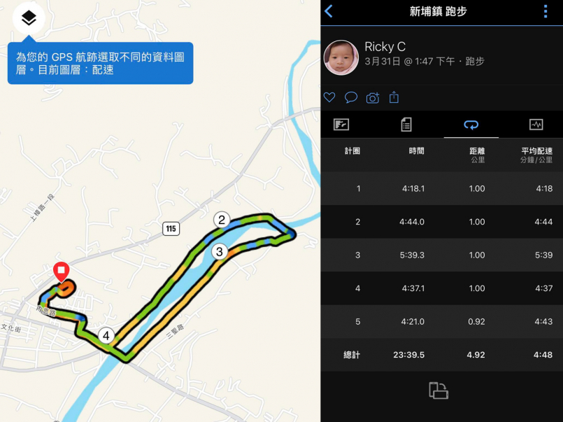 按下手錶,看了自己配速,嗯!出發有點快,加上折返時拍照逗留,整體來說還算可以啦!